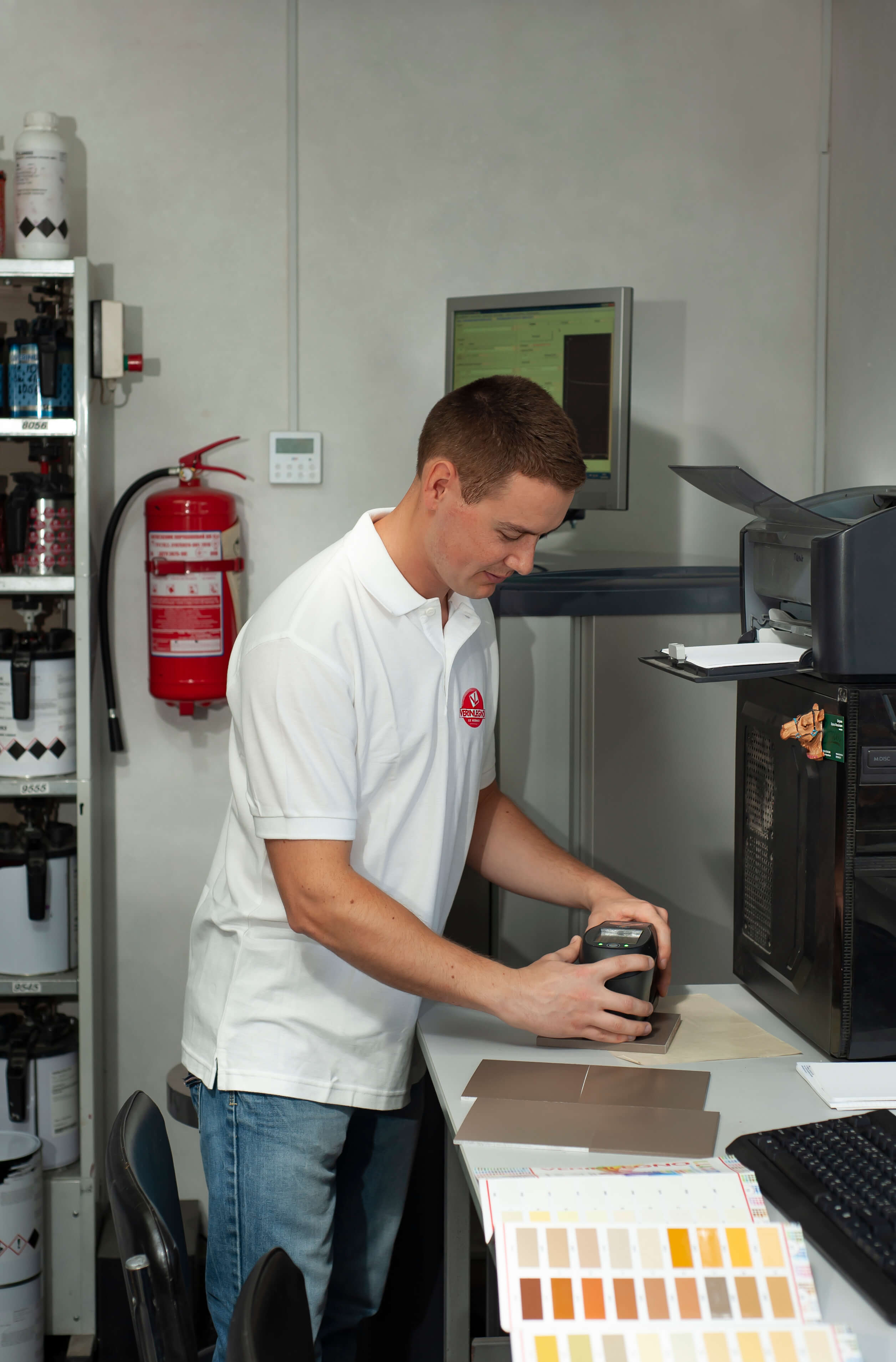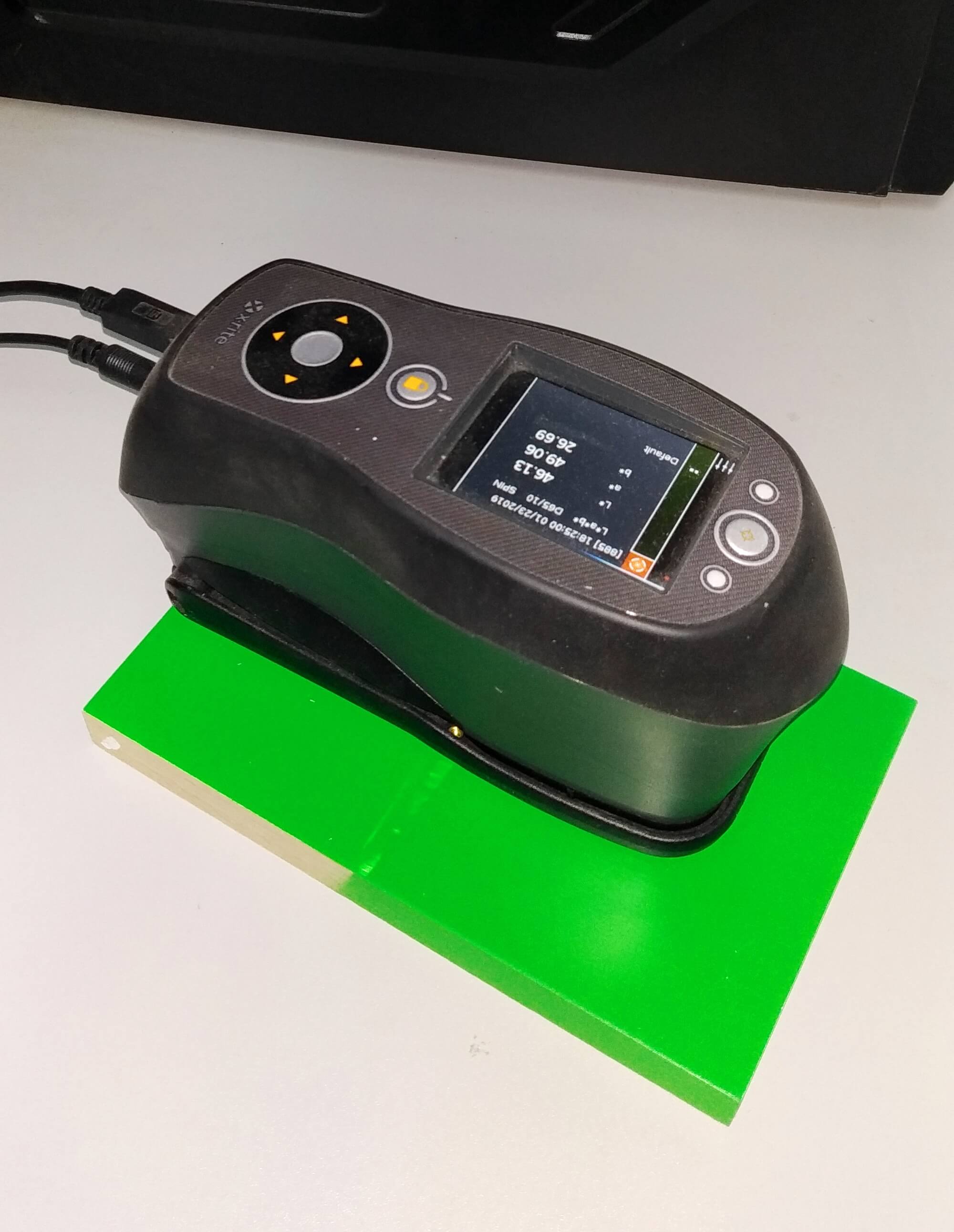 Спектрофотометр визначає спектри відбиття і наявність барвників у кольорі. Отримані результати виводяться у вигляді графіка. Після декількох тестів технолог вибирає найбільш відповідний варіант. У своїй роботі ми використовуємо прилади з високими показниками чутливості, що можуть виявити наявність пігменту до міліграму. Для точного визначення кольору, поверхня зразка повинна бути рівною, без дефектів та деформацій.