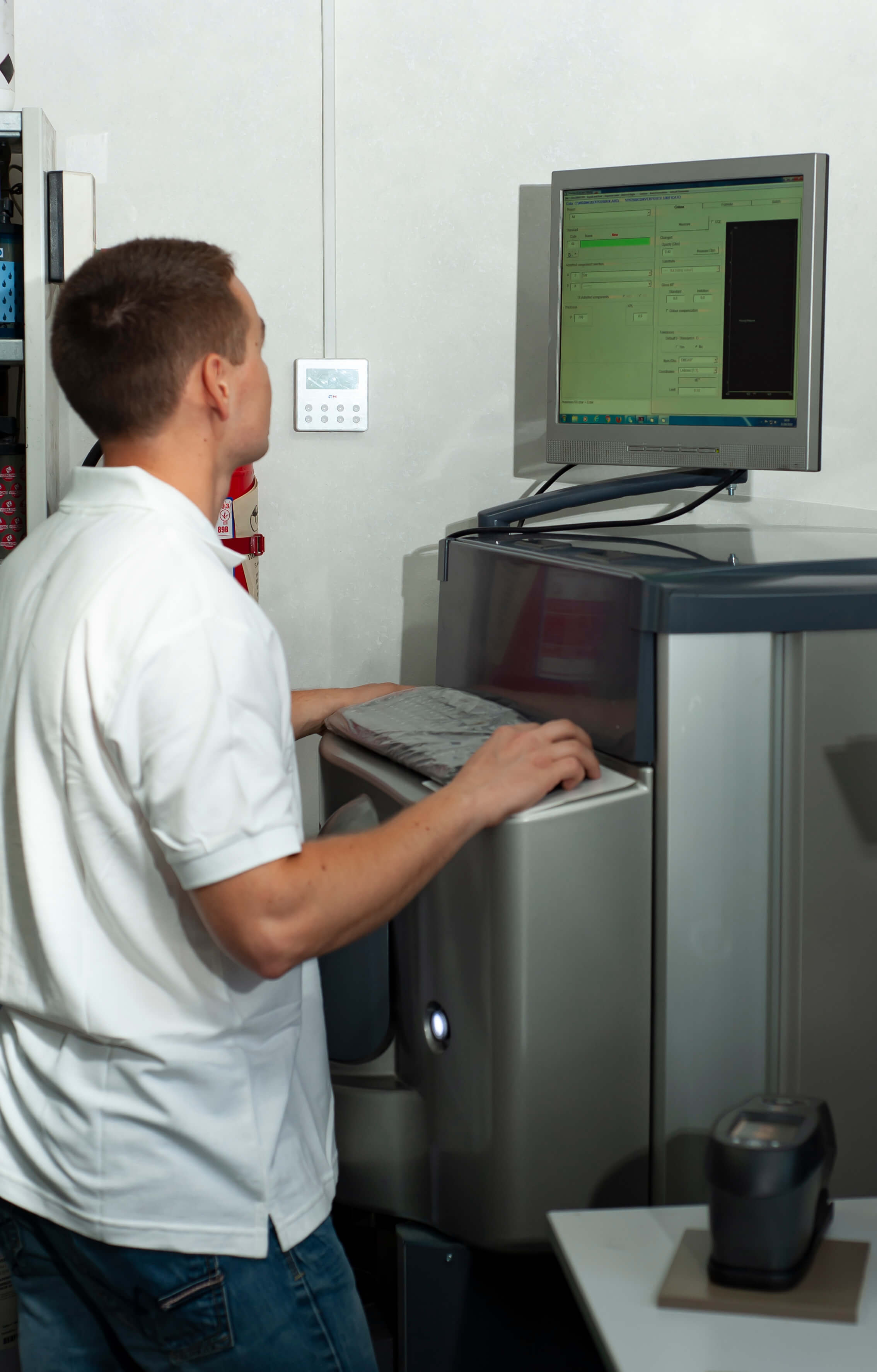 Визначення і обробка інформації при використанні спектрофотометра займає дуже мало часу, до хвилини. Після чого видається формула із вмістом частин барвників, які входять до складу робочої суміші. За цією формулою виготовляється тестовий зразок фарби, вимальовується та перевіряється на відповідність. Якщо присутні розбіжності, то технолог коректує отриманий результат вручну. Дане обладнання дозволяє напрочуд швидко проводити підбір кольору. Зазвичай підбір кольору може бути виконаний в день отримання зразку для підбору.