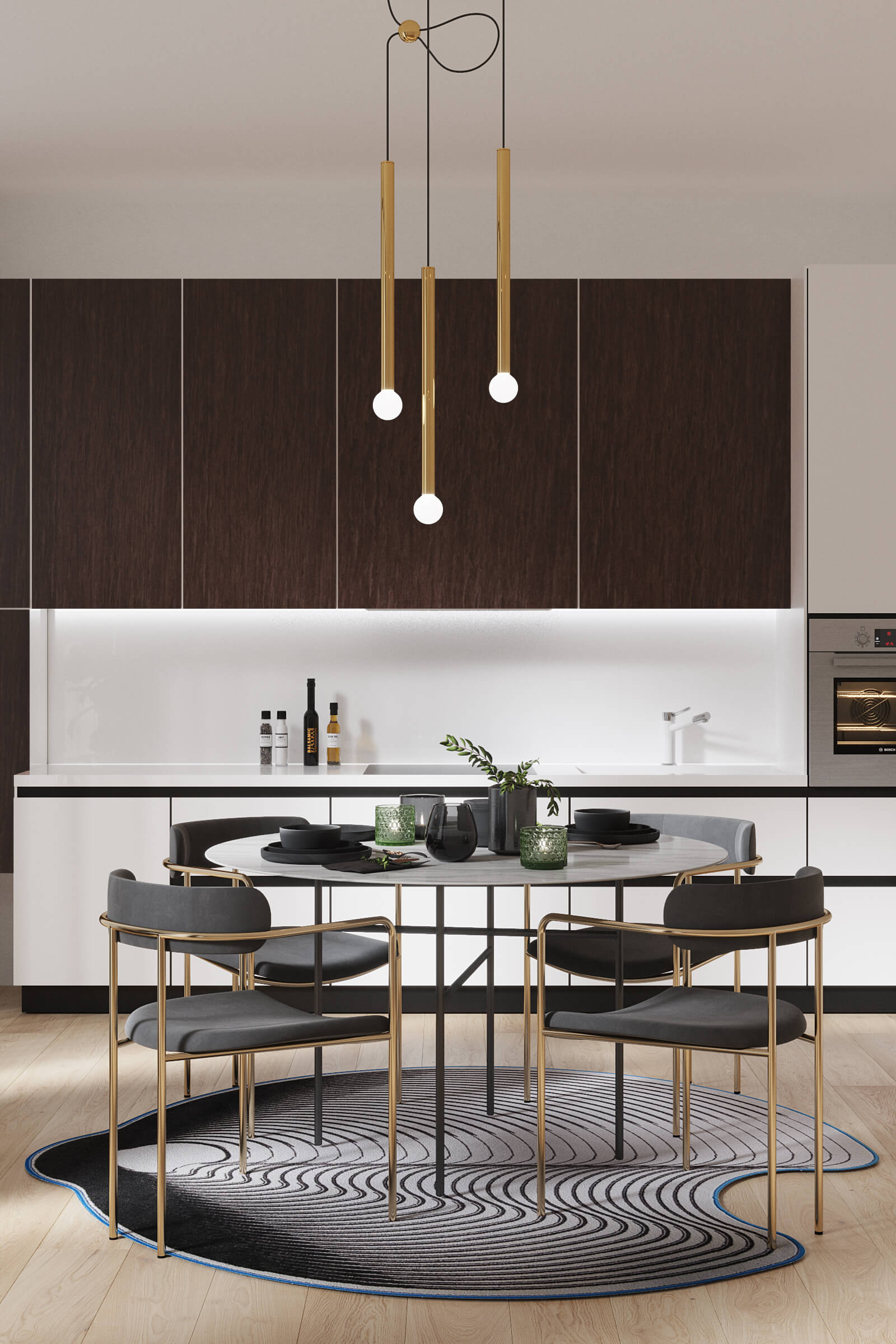 Завдяки динаміці ліній ми передаємо неповторну красу натуральних фасадів створених із шпону файн-лайн ГОРІХ КАРАВАДЖІО. Живий матеріал модифікованого шпону від Classic Veneer та чисті лінії створюють настрій всього інтер’єру.