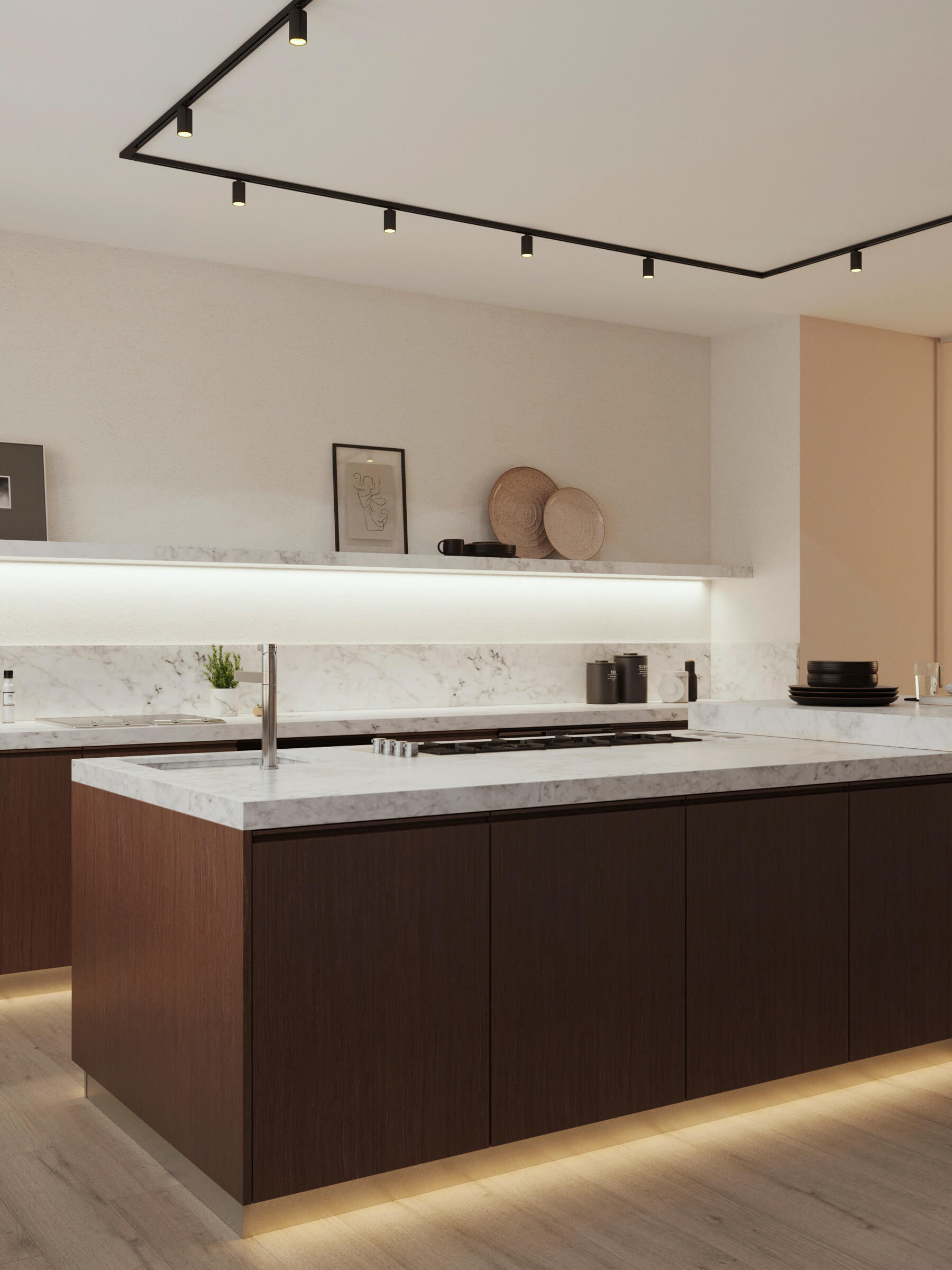 Інтер’єр представленої кухні наповнений світлими та м’якими кольорами. Кухонний простір використаний з максимальною користю не лише для практичності але й для зручного догляду. Окремою яскравою особливістю є шпоновані фасади, які доповнюють приміщення природністю та натуральністю. Такі відтінки допомагають розслабитися, даруючи тепло і затишок. Освітлення кухні в поєднанні з м’якими кольорами надає приміщенню свіжість та збалансованість.
