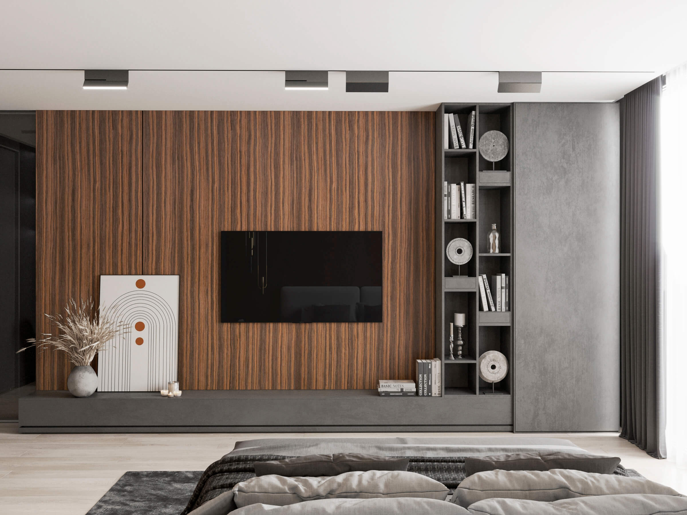 Лаконічність – головна риса інтер’єру спальні в сучасному стилі. Обробка підлоги, фасадів, стін з натуральних матеріалів є ідеальним способом для створення заспокійливої атмосфери у зонах відпочинку. Презентуємо Вам зовнішній вигляд кімнати комфорту створену на основі шпону, як декоративної функції. У виконаному проекті використовували на МДФ основу – модифікований шпон ЕБЕН БОЛІВІЙСЬКИЙ. Стінові панелі та фасади меблів – поєднують ультрасучасний дизайн, екологічну безпеку та красу. Шпоновані фасади покриті новинкою Verinlegno, з ряду акрилових, прозорих, матових лаків – ACRYSTONE PLUS 5312 Е , додаючи виробам практичності. Надзвичайна твердість та стійкість лаку захистить меблі від подряпин, хімічних та температурних впливів, вологи та забезпечить незмінним кольором на довгі роки.