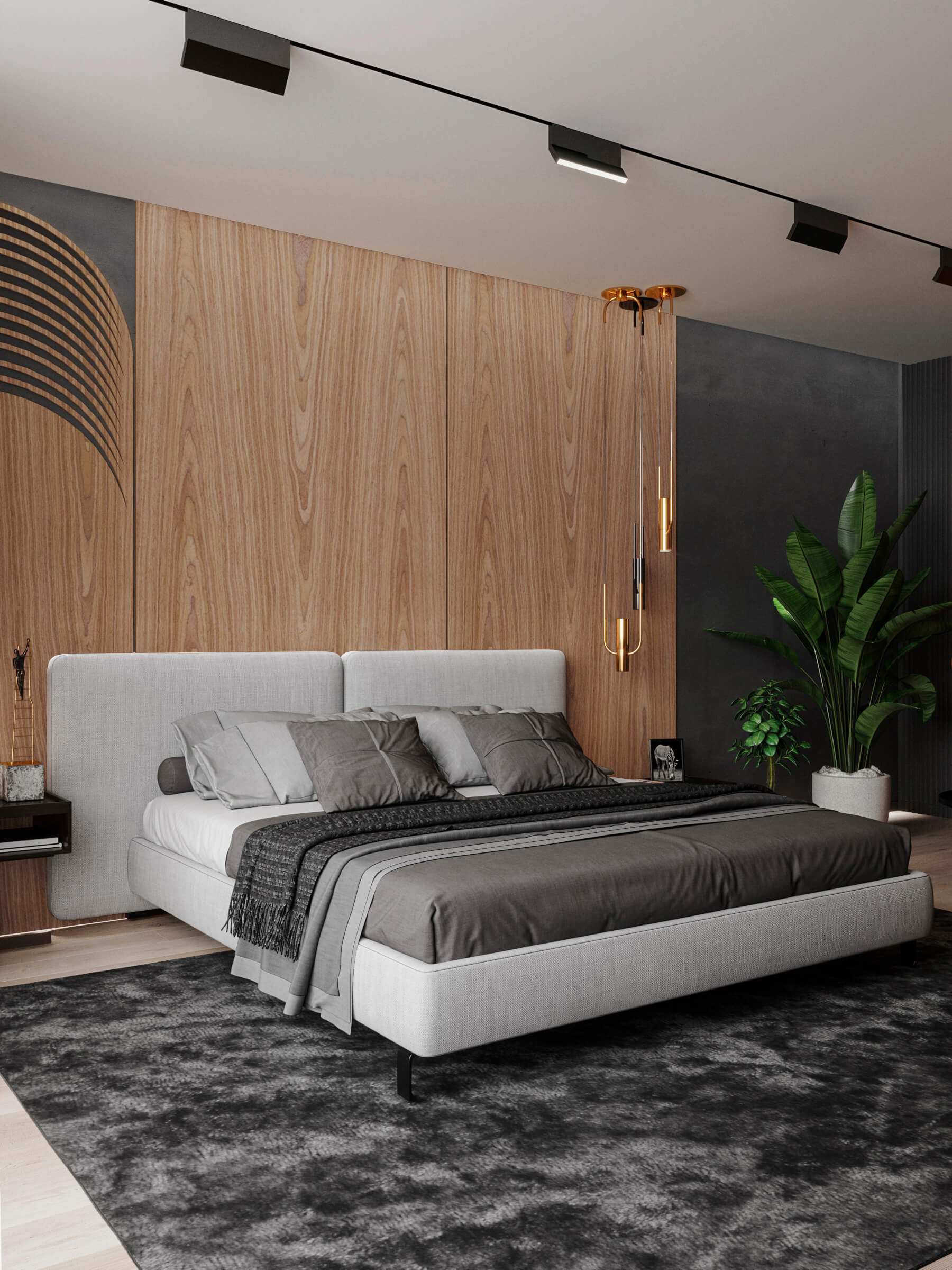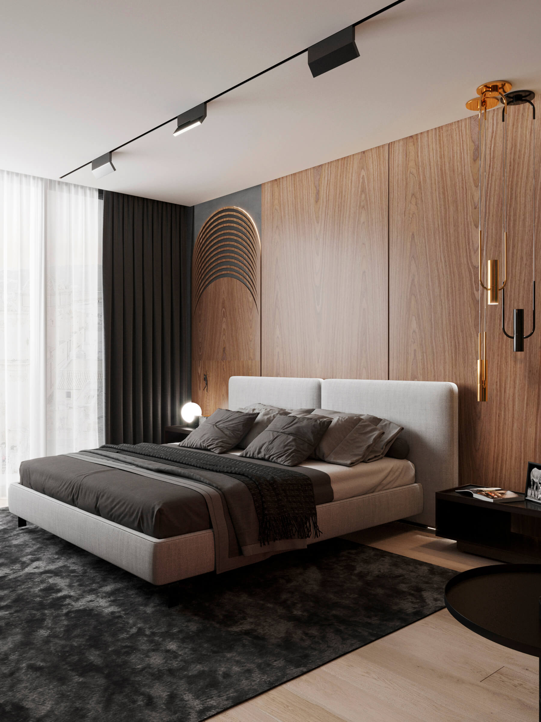 Лаконічність – головна риса інтер’єру спальні в сучасному стилі. Обробка підлоги, фасадів, стін з натуральних матеріалів є ідеальним способом для створення заспокійливої атмосфери у зонах відпочинку. Презентуємо Вам зовнішній вигляд кімнати комфорту створену на основі шпону, як декоративної функції. У виконаному проекті використовували на МДФ основу – модифікований шпон ГОРІХ ІТАЛІЙСЬКИЙ. Стінові панелі та фасади меблів – поєднують ультрасучасний дизайн, екологічну безпеку та красу. Шпоновані фасади покриті новинкою Verinlegno, з ряду акрилових, прозорих, матових лаків – ACRYSTONE PLUS 5312 Е , додаючи виробам практичності. Надзвичайна твердість та стійкість лаку захистить меблі від подряпин, хімічних та температурних впливів, вологи та забезпечить незмінним кольором на довгі роки.