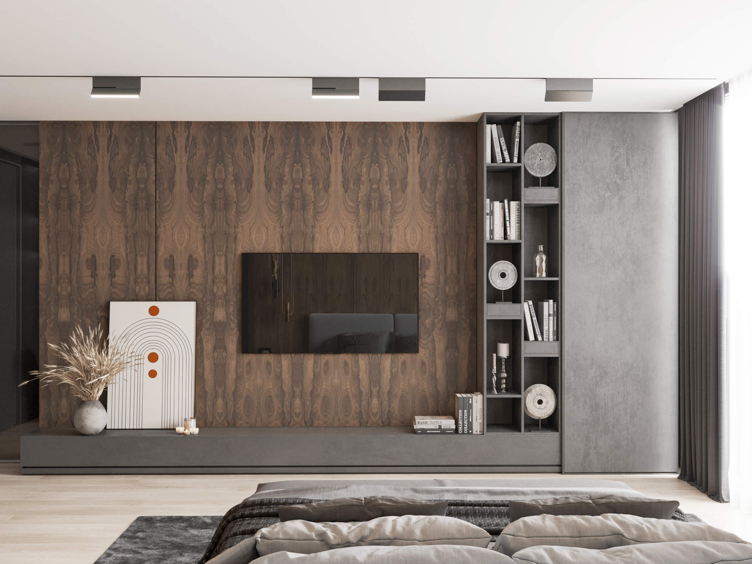 Лаконічність – головна риса інтер’єру спальні в сучасному стилі. Обробка підлоги, фасадів, стін з натуральних матеріалів є ідеальним способом для створення заспокійливої атмосфери у зонах відпочинку. Презентуємо Вам зовнішній вигляд кімнати комфорту створену на основі шпону, як декоративної функції. У виконаному проекті використовували на МДФ основу – натуральний шпон – ЗІРОКОТЕ. Стінові панелі та фасади меблів – поєднують ультрасучасний дизайн, екологічну безпеку та красу. Шпоновані фасади покриті новинкою Verinlegno, з ряду акрилових, прозорих, матових лаків – ACRYSTONE PLUS 5312 Е , додаючи виробам практичності. Надзвичайна твердість та стійкість лаку захистить меблі від подряпин, хімічних та температурних впливів, вологи та забезпечить незмінним кольором на довгі роки.